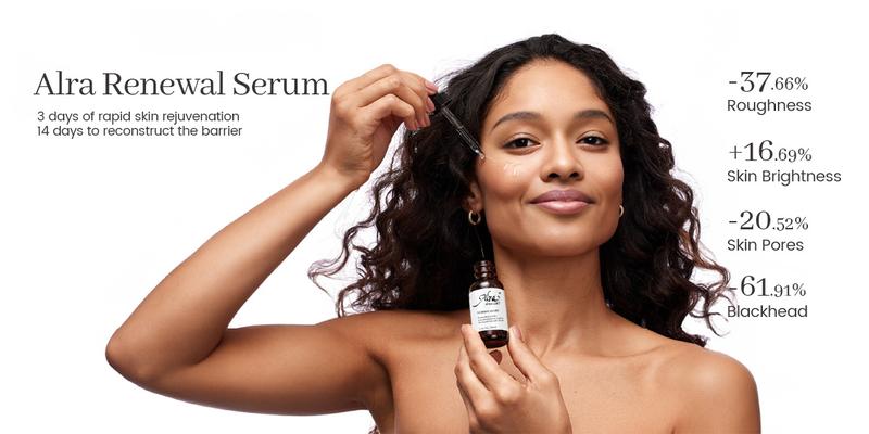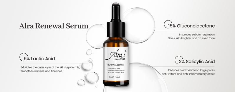 Alra Renewal Serum is designed for skin with visible imperfections and uneven texture. It is formulated with 5% Lactic Acid, 2% Salicylic Acid, and 15% Gluconolactone. This serum helps refine the skin's surface, strengthen the skin barrier, and delivers noticeable improvements, revealing a smoother, more radiant, and even complexion.