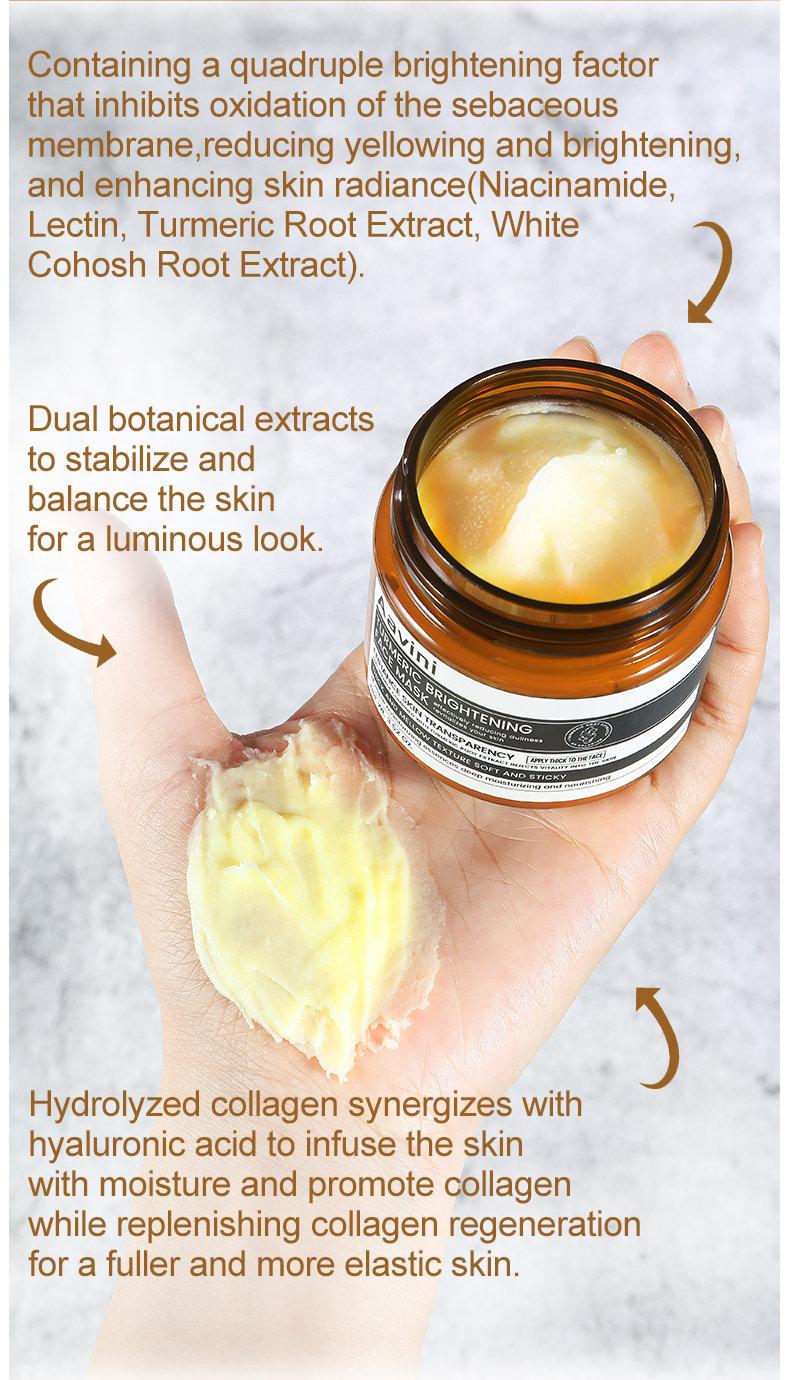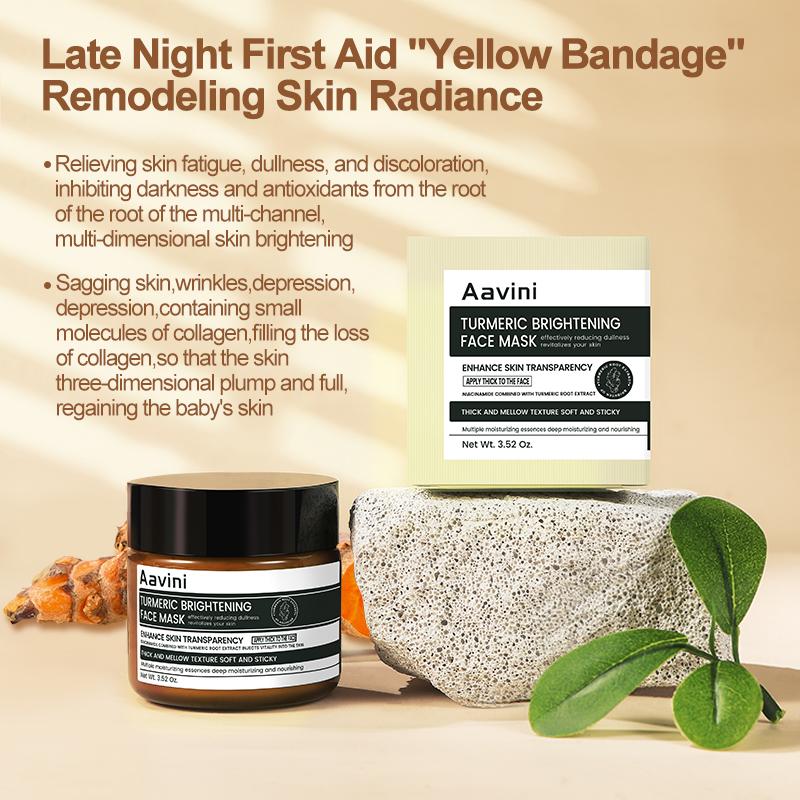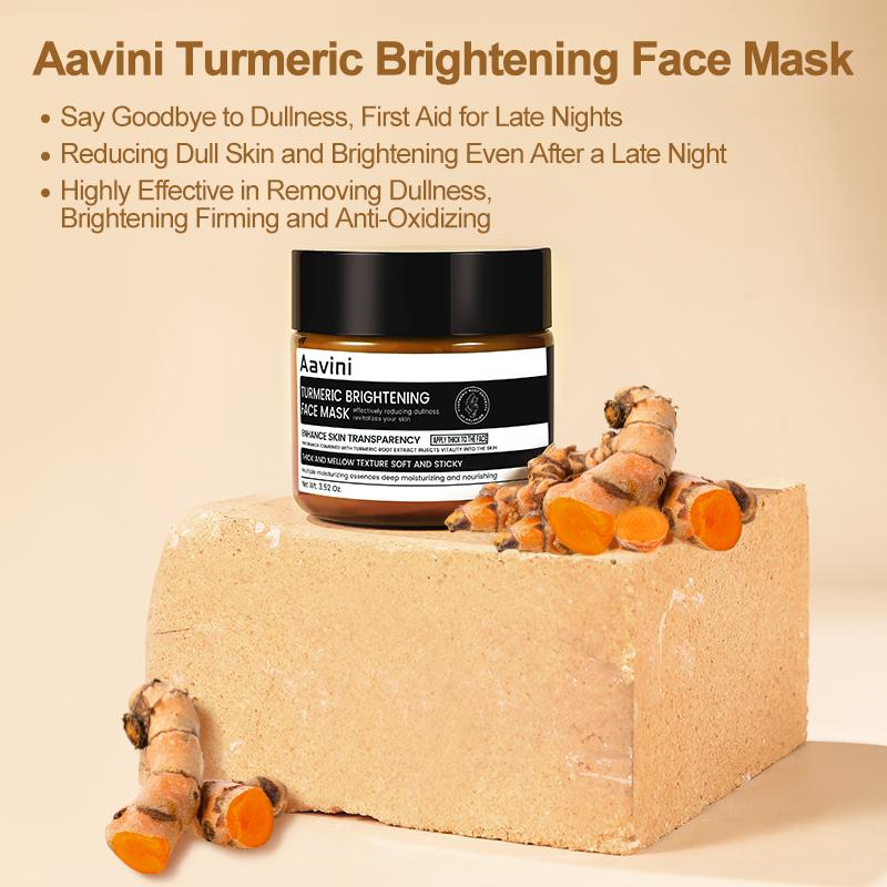 Aavini Turmeric Brightening Face Mask is specially designed for repairing tired, dull, and lackluster skin caused by late nights. It blends turmeric root extract, niacinamide, and other brightening agents to help restore skin's radiance, reduce yellowing, and slow down signs of aging. The unique buttery, mashed-potato texture gently adheres to the skin, delivering deep nourishment and giving the skin a natural glow.